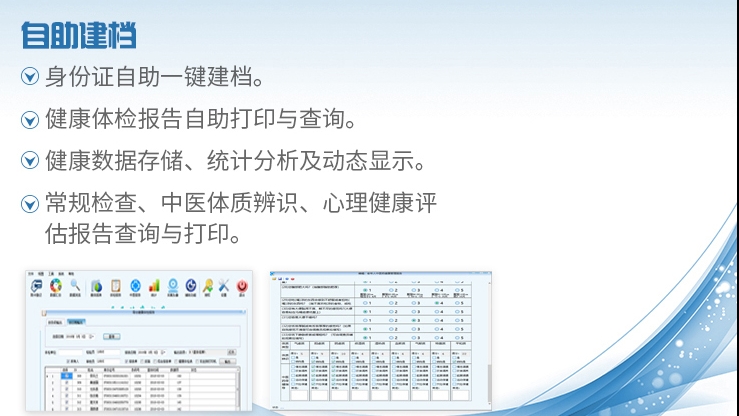 支持智能監(jiān)測設備接入,進行數(shù)據(jù)的長期追蹤、分析與評估。數(shù)據(jù)按及地方標準建立,內(nèi)置中醫(yī)體質(zhì)辨識,醫(yī)生可現(xiàn)場分析中醫(yī)體質(zhì)。
